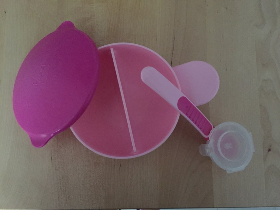 What is great about this bowl is that it’s separated in two so you can have your dinner and a dessert in one container. The way is seperated is very good as it doesn’t let one food lik in to the other part of the container. Saves a lot of space !