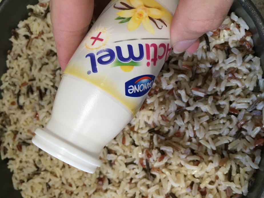 Prepare round, 30cm cake tin by coating it in a very thin layer of butter. Put half of your rice in to the cake tin, then add your apples and cover it with the remaining rice. Pour over actimel.
